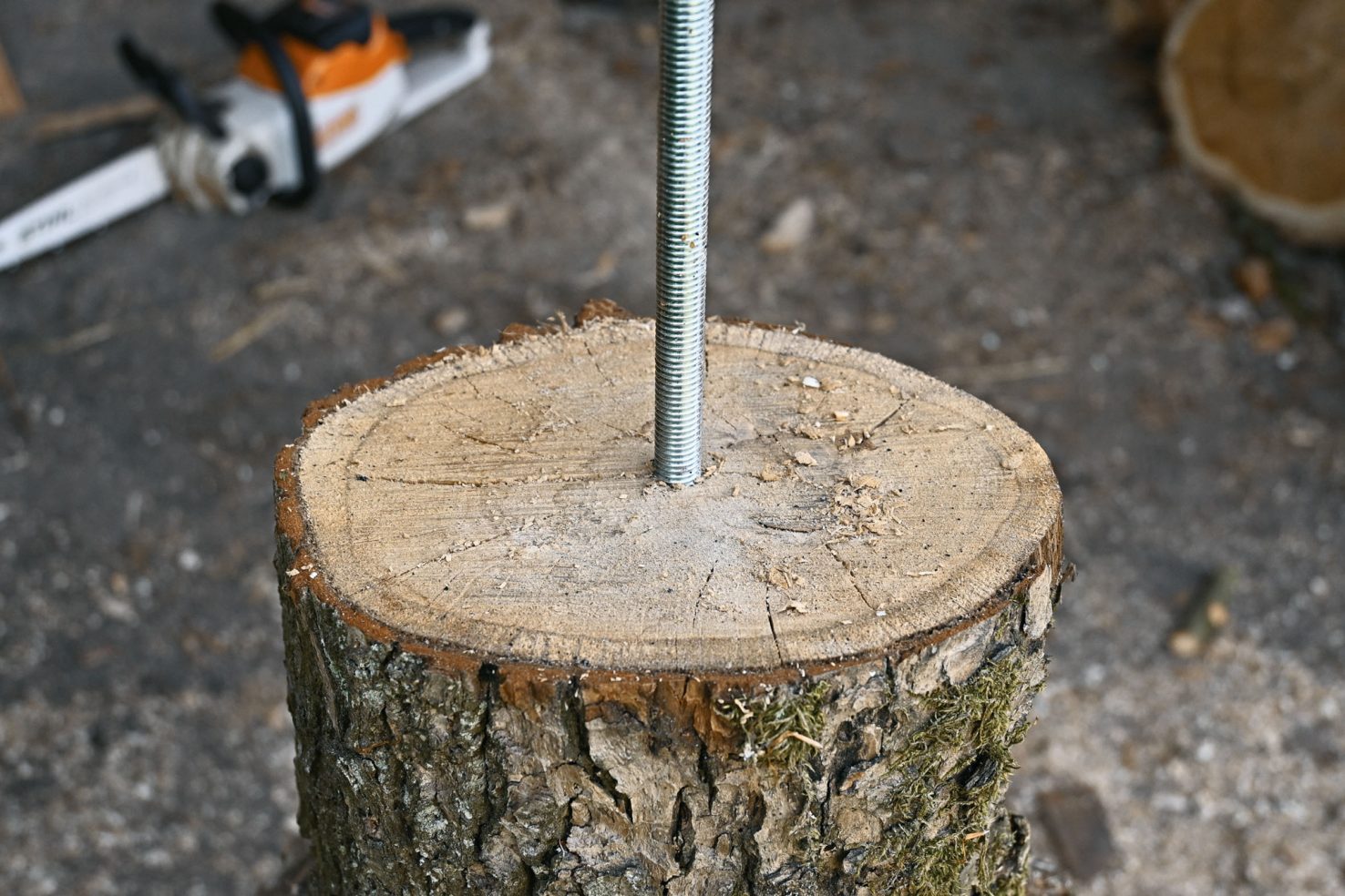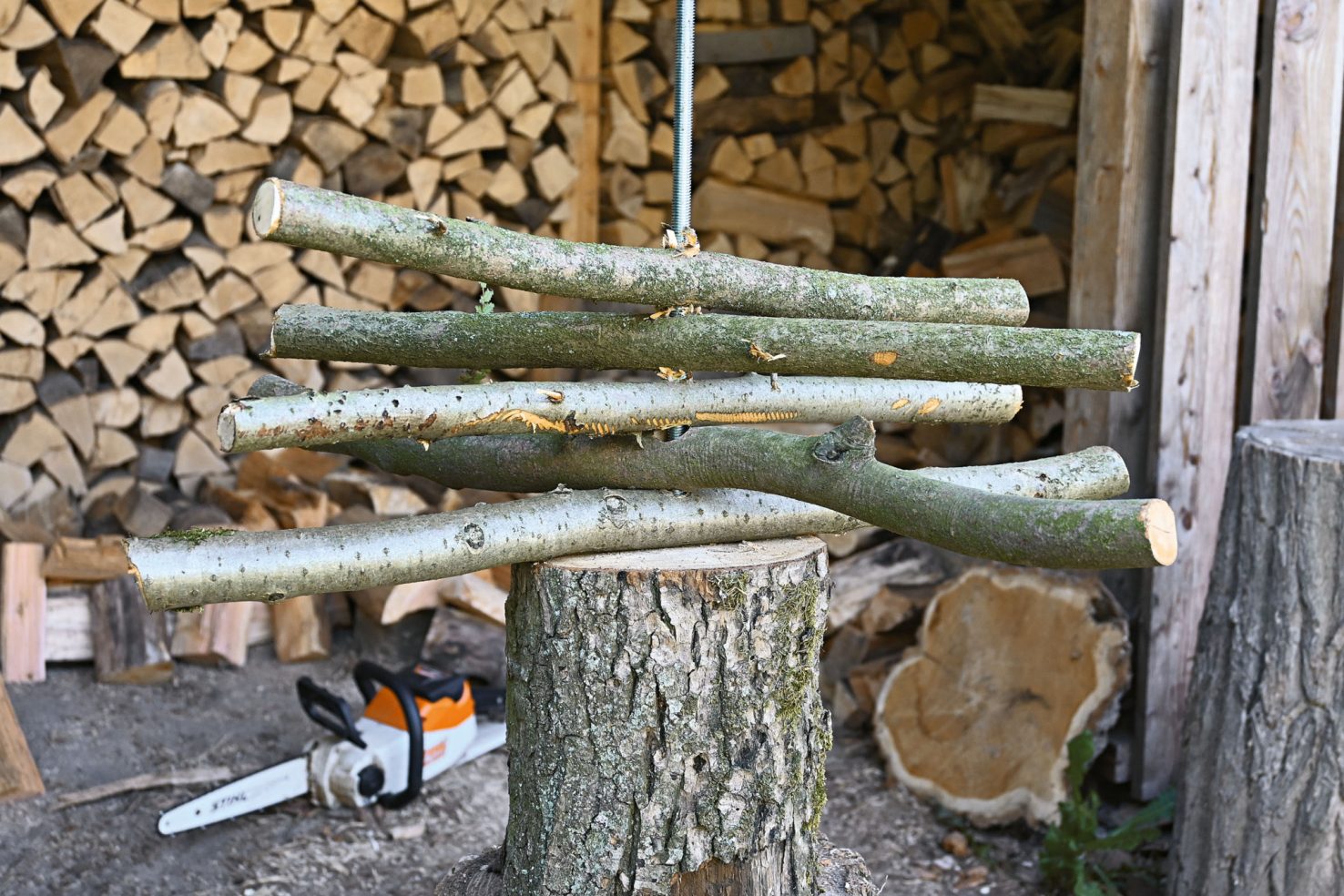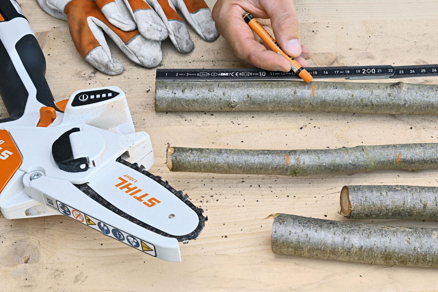 Esmalt loo sobiv tööpind, et puunott, millest saab tulevase jõulupuu aluspakk (jalg) ära ei veereks, kui selle sobivasse mõõtu saed. Mõõtu saagimiseks haara näiteks MSA 120 akusaag, mis on nikerdamiseks ja puutööks ideaalne abiline. Pakk sae umbes 25 cm kõrguseks, sae kindlasti risti paku teljega, sest muidu jääb jõulupuu pärast vildakaks.